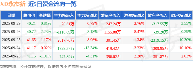 证券之星消息,截至2025年9月29日收盘,XD永杰新(603271)报收于40.21元,下跌0.81%,换手率5.63%,成交量2.22万手,成交额8949.13万元。