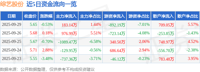 证券之星消息,截至2025年9月29日收盘,综艺股份(600770)报收于5.65元,下跌0.53%,换手率1.75%,成交量22.72万手,成交额1.27亿元。