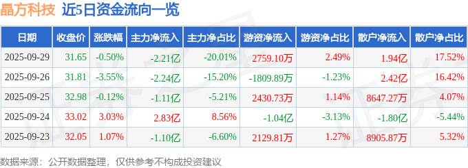证券之星消息,截至2025年9月29日收盘,晶方科技(603005)报收于31.65元,下跌0.5%,换手率5.35%,成交量34.91万手,成交额11.07亿元。