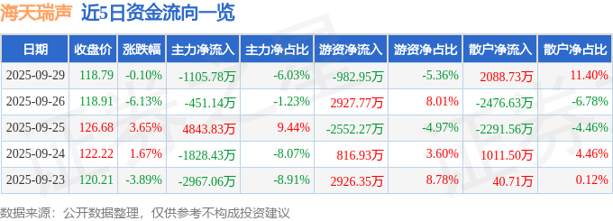 证券之星消息,截至2025年9月29日收盘,海天瑞声(688787)报收于118.79元,下跌0.1%,换手率2.56%,成交量1.54万手,成交额1.83亿元。