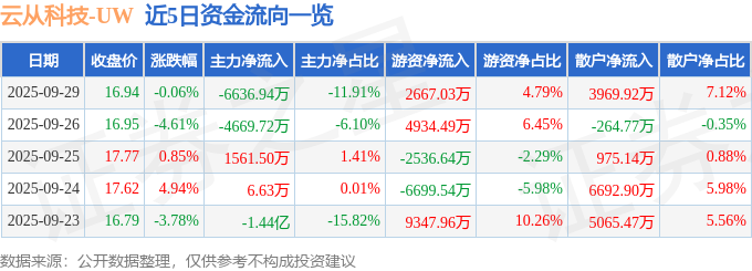 证券之星消息,截至2025年9月29日收盘,云从科技(688327)报收于16.94元,下跌0.06%,换手率3.97%,成交量33.07万手,成交额5.57亿元。