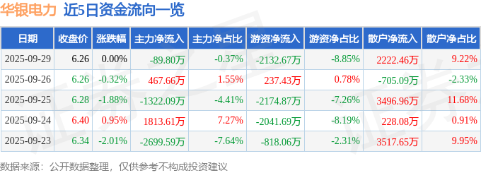 证券之星消息,截至2025年9月29日收盘,华银电力(600744)报收于6.26元,上涨0.0%,换手率1.9%,成交量38.58万手,成交额2.41亿元。