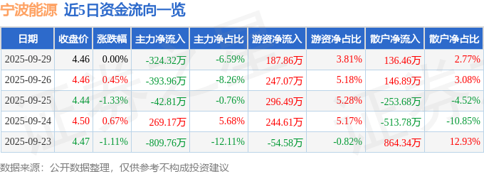 证券之星消息,截至2025年9月29日收盘,宁波能源(600982)报收于4.46元,上涨0.0%,换手率0.99%,成交量11.08万手,成交额4925.16万元。