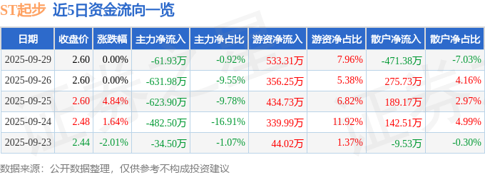 证券之星消息,截至2025年9月29日收盘,ST起步(603557)报收于2.6元,上涨0.0%,换手率4.08%,成交量25.43万手,成交额6701.19万元。