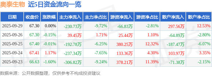证券之星消息,截至2025年9月29日收盘,奥泰生物(688606)报收于67.3元,上涨0.0%,换手率0.45%,成交量3544.0手,成交额2374.22万元。