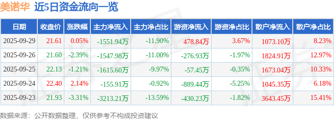 证券之星消息,截至2025年9月29日收盘,美诺华(603538)报收于21.61元,上涨0.05%,换手率2.81%,成交量6.06万手,成交额1.3亿元。