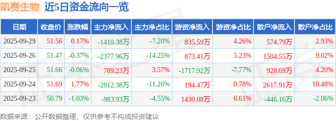 证券之星消息,截至2025年9月29日收盘,凯赛生物(688065)报收于51.56元,上涨0.17%,换手率0.66%,成交量3.84万手,成交额1.96亿元。