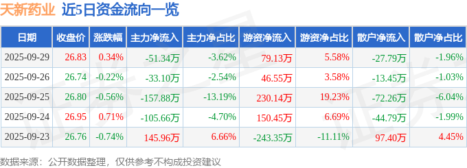 证券之星消息,截至2025年9月29日收盘,天新药业(603235)报收于26.83元,上涨0.34%,换手率0.36%,成交量5336.0手,成交额1419.21万元。