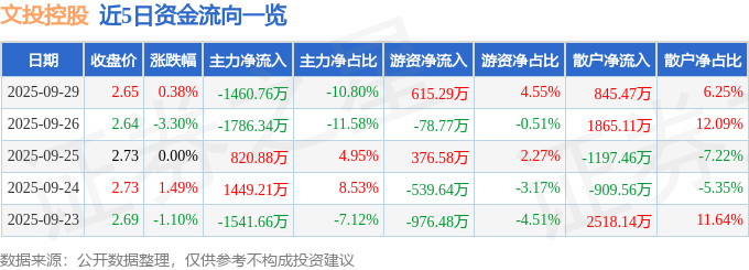 证券之星消息,截至2025年9月29日收盘,文投控股(600715)报收于2.65元,上涨0.38%,换手率1.94%,成交量51.56万手,成交额1.35亿元。
