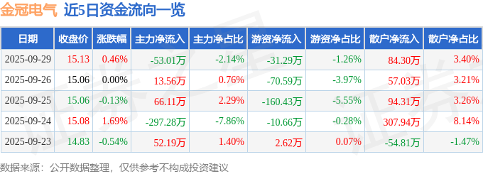 证券之星消息,截至2025年9月29日收盘,金冠电气(688517)报收于15.13元,上涨0.46%,换手率1.2%,成交量1.64万手,成交额2479.65万元。