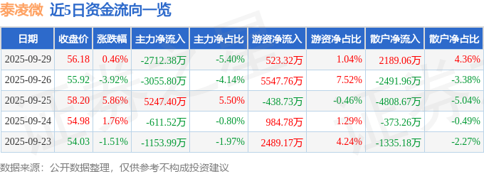 证券之星消息,截至2025年9月29日收盘,泰凌微(688591)报收于56.18元,上涨0.46%,换手率5.36%,成交量9.03万手,成交额5.02亿元。