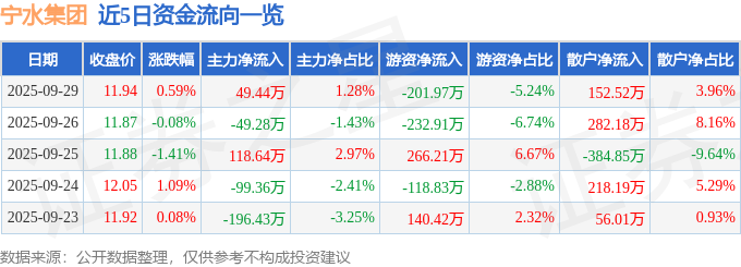 证券之星消息,截至2025年9月29日收盘,宁水集团(603700)报收于11.94元,上涨0.59%,换手率1.61%,成交量3.24万手,成交额3856.23万元。