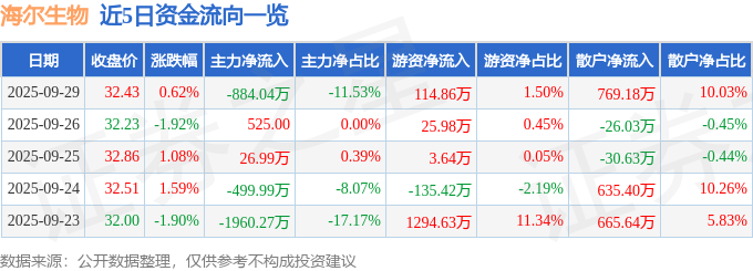 证券之星消息,截至2025年9月29日收盘,海尔生物(688139)报收于32.43元,上涨0.62%,换手率0.75%,成交量2.39万手,成交额7667.25万元。