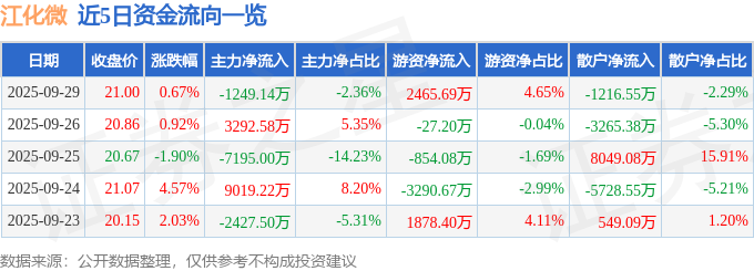 证券之星消息,截至2025年9月29日收盘,江化微(603078)报收于21.0元,上涨0.67%,换手率6.56%,成交量25.3万手,成交额5.3亿元。