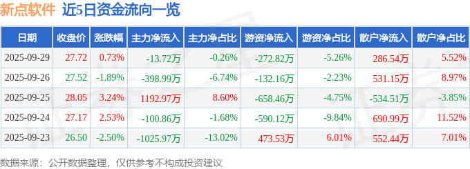 证券之星消息,截至2025年9月29日收盘,新点软件(688232)报收于27.72元,上涨0.73%,换手率0.57%,成交量1.87万手,成交额5188.09万元。
