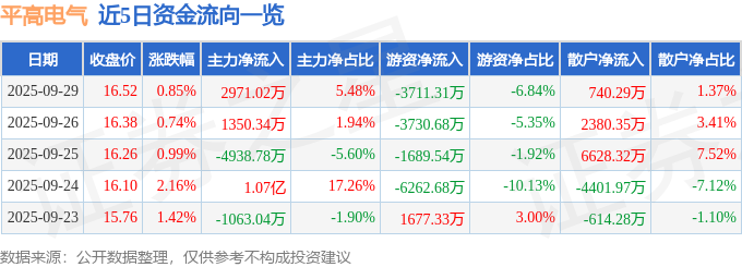 证券之星消息,截至2025年9月29日收盘,平高电气(600312)报收于16.52元,上涨0.85%,换手率2.43%,成交量33.03万手,成交额5.42亿元。