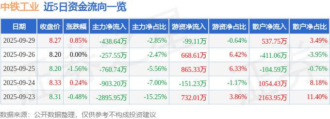证券之星消息,截至2025年9月29日收盘,中铁工业(600528)报收于8.27元,上涨0.85%,换手率0.84%,成交量18.74万手,成交额1.54亿元。