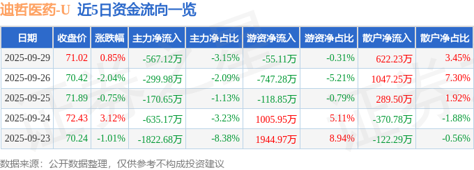 证券之星消息,截至2025年9月29日收盘,迪哲医药(688192)报收于71.02元,上涨0.85%,换手率0.63%,成交量2.57万手,成交额1.8亿元。