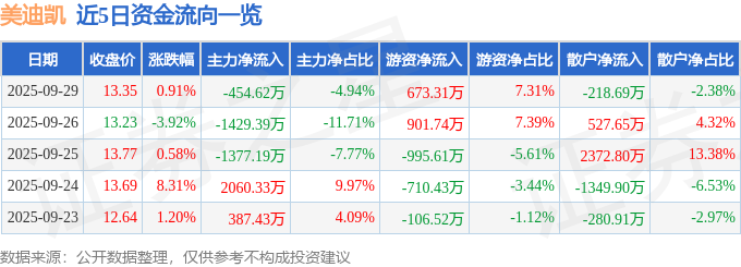 证券之星消息,截至2025年9月29日收盘,美迪凯(688079)报收于13.35元,上涨0.91%,换手率1.75%,成交量6.95万手,成交额9204.79万元。