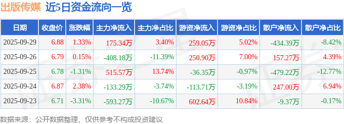 证券之星消息,截至2025年9月29日收盘,出版传媒(601999)报收于6.88元,上涨1.33%,换手率1.37%,成交量7.54万手,成交额5160.44万元。