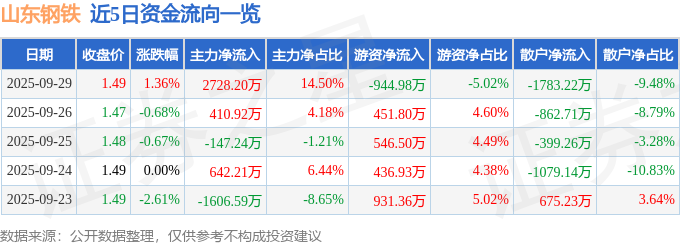 证券之星消息,截至2025年9月29日收盘,山东钢铁(600022)报收于1.49元,上涨1.36%,换手率1.2%,成交量128.07万手,成交额1.88亿元。