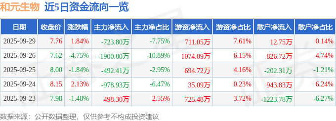 证券之星消息,截至2025年9月29日收盘,和元生物(688238)报收于7.76元,上涨1.84%,换手率1.9%,成交量12.17万手,成交额9342.74万元。