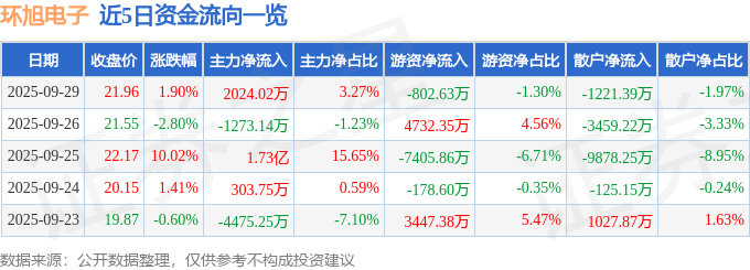 证券之星消息,截至2025年9月29日收盘,环旭电子(601231)报收于21.96元,上涨1.9%,换手率1.29%,成交量28.42万手,成交额6.19亿元。