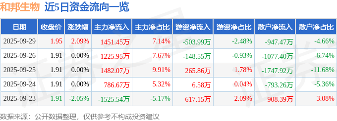 证券之星消息,截至2025年9月29日收盘,和邦生物(603077)报收于1.95元,上涨2.09%,换手率1.2%,成交量105.73万手,成交额2.03亿元。