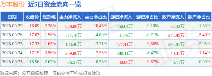 证券之星消息,截至2025年9月29日收盘,万丰股份(603172)报收于18.09元,上涨2.38%,换手率5.71%,成交量2.86万手,成交额5064.22万元。