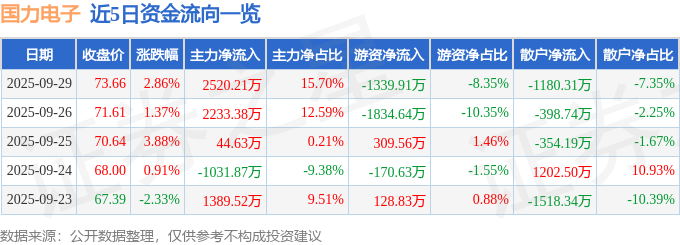 证券之星消息,截至2025年9月29日收盘,国力电子(688103)报收于73.66元,上涨2.86%,换手率2.3%,成交量2.19万手,成交额1.61亿元。
