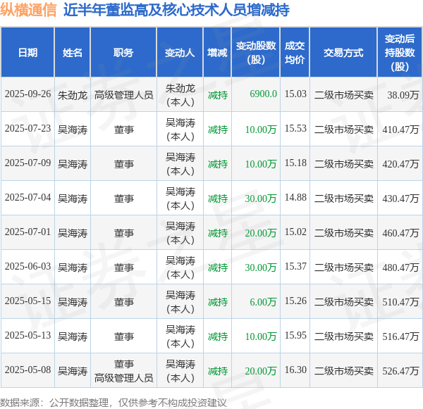 纵横通信近半年内的董监高及核心技术人员增减持详情如下: