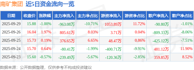 证券之星消息,截至2025年9月29日收盘,南矿集团(001360)报收于15.88元,下跌1.0%,换手率6.87%,成交量5.62万手,成交额8989.57万元。