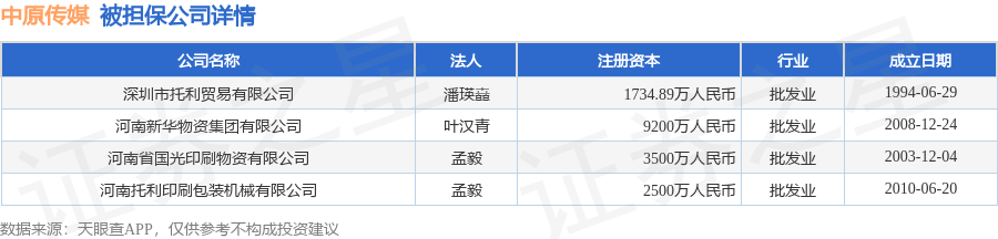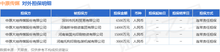 中原传媒9月28日披露4笔对外担保,被担保公司4家。对外担保明细如下表: