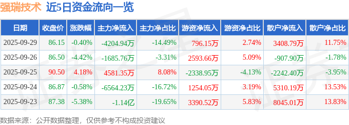 证券之星消息,截至2025年9月29日收盘,强瑞技术(301128)报收于86.15元,下跌0.4%,换手率3.84%,成交量3.39万手,成交额2.9亿元。