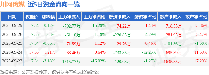 证券之星消息,截至2025年9月29日收盘,川网传媒(300987)报收于17.34元,下跌0.12%,换手率1.74%,成交量3.01万手,成交额5183.83万元。