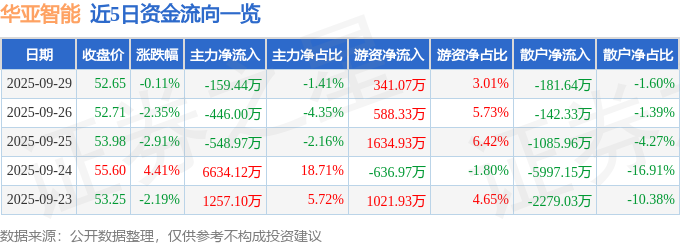 证券之星消息,截至2025年9月29日收盘,华亚智能(003043)报收于52.65元,下跌0.11%,换手率2.68%,成交量2.14万手,成交额1.13亿元。