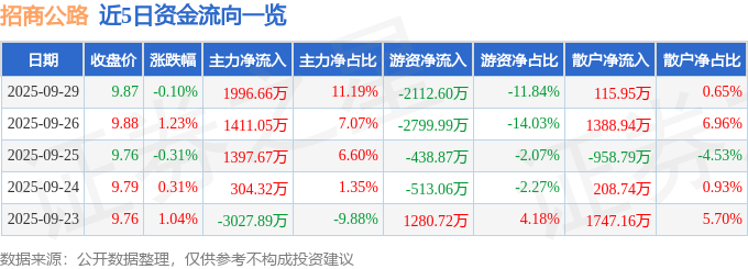 证券之星消息,截至2025年9月29日收盘,招商公路(001965)报收于9.87元,下跌0.1%,换手率0.27%,成交量18.13万手,成交额1.78亿元。