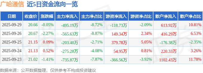 9月29日的资金流向数据方面,主力资金净流出495.19万元,占总成交额8.72%,游资资金净流出118.73万元,占总成交额2.09%,散户资金净流入613.92万元,占总成交额10.81%。