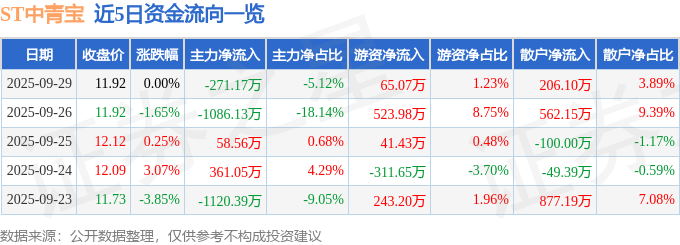 证券之星消息,截至2025年9月29日收盘,ST中青宝(300052)报收于11.92元,上涨0.0%,换手率1.7%,成交量4.44万手,成交额5294.66万元。