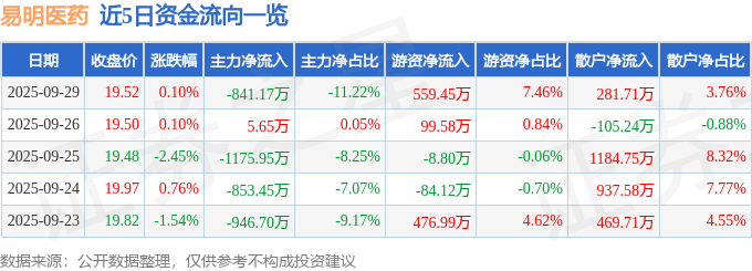 证券之星消息,截至2025年9月29日收盘,易明医药(002826)报收于19.52元,上涨0.1%,换手率2.21%,成交量3.84万手,成交额7498.26万元。