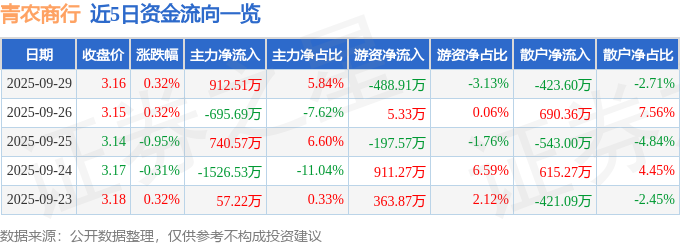 证券之星消息,截至2025年9月29日收盘,青农商行(002958)报收于3.16元,上涨0.32%,换手率1.01%,成交量49.67万手,成交额1.56亿元。