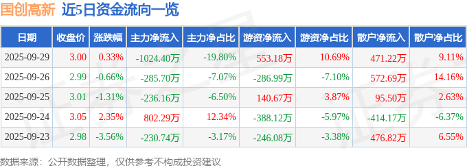 证券之星消息,截至2025年9月29日收盘,国创高新(002377)报收于3.0元,上涨0.33%,换手率1.99%,成交量17.34万手,成交额5173.36万元。