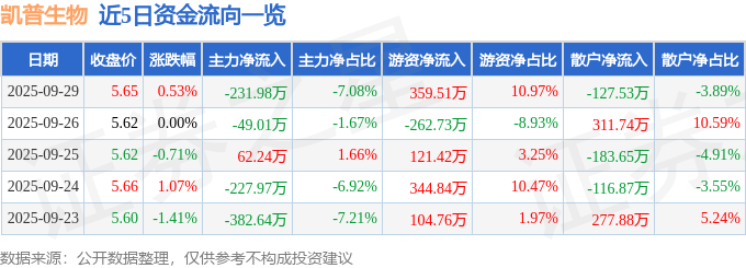 证券之星消息,截至2025年9月29日收盘,凯普生物(300639)报收于5.65元,上涨0.53%,换手率0.92%,成交量5.87万手,成交额3278.34万元。