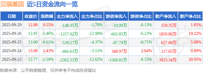 证券之星消息,截至2025年9月29日收盘,贝瑞基因(000710)报收于12.88元,上涨0.55%,换手率2.07%,成交量6.82万手,成交额8712.37万元。