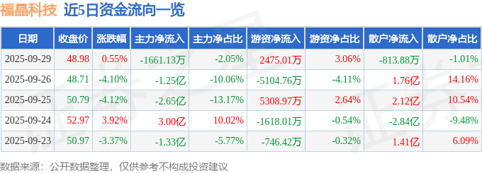 证券之星消息,截至2025年9月29日收盘,福晶科技(002222)报收于48.98元,上涨0.55%,换手率3.54%,成交量16.57万手,成交额8.08亿元。