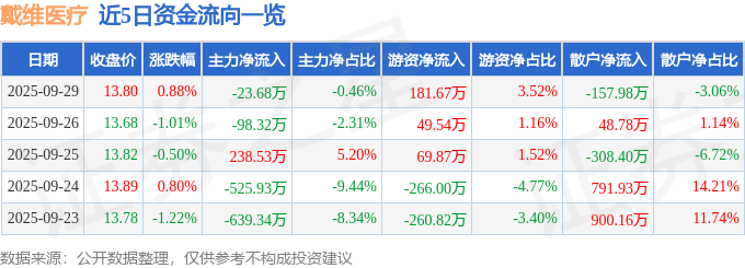 证券之星消息,截至2025年9月29日收盘,戴维医疗(300314)报收于13.8元,上涨0.88%,换手率2.62%,成交量3.76万手,成交额5165.0万元。