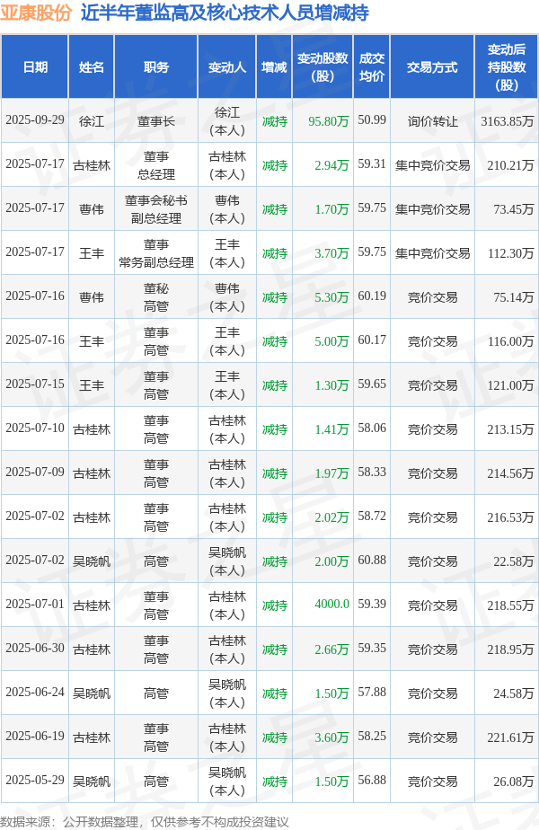 亚康股份近半年内的董监高及核心技术人员增减持详情如下: