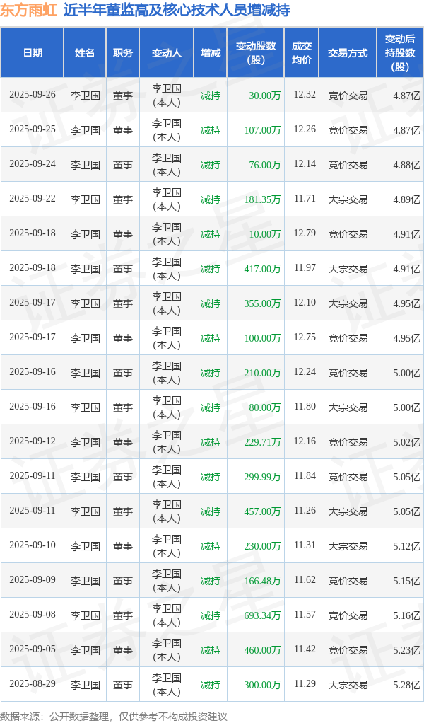 东方雨虹近半年内的董监高及核心技术人员增减持详情如下: