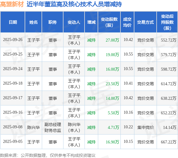 高盟新材近半年内的董监高及核心技术人员增减持详情如下: