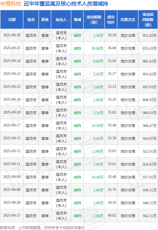 中简科技近半年内的董监高及核心技术人员增减持详情如下: